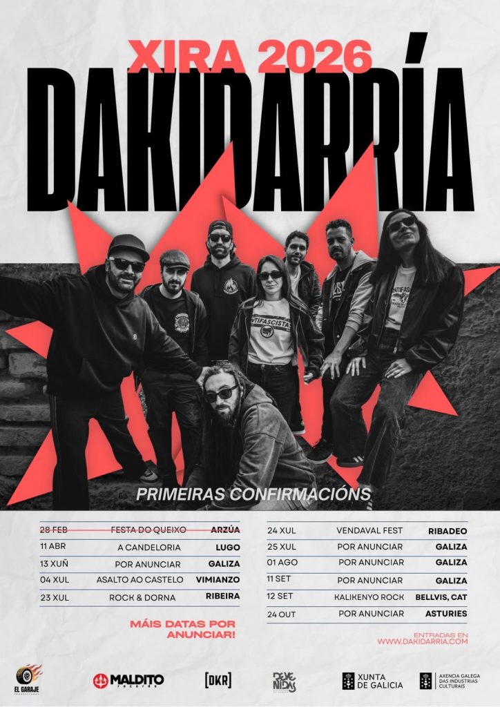 | 11.04 – A Candeloria – Lugo 13.06 – Por anunciar – Galiza 25.05 – Por anunciar – Galiza 04.07 – Asalto Ao Castelo – Vimianzo 23.07 – Rock & Dorna – Ribeira 24.07 – Vendaval Fest – Ribadeo 01.08 – Por anunciar – Galiza 11.09 – Por anunciar – Galiza 12.09 – Kalikenyo Rock – Bellvis, Catalunya 20.10 – Por anunciar – Asturies Con este nuevo trabajo, Dakidarría no solo reafirma su identidad artística, sino que también abre una puerta a nuevas emociones, demostrando que la música sigue siendo un vehículo único para contar las historias más universales desde lo más personal. |