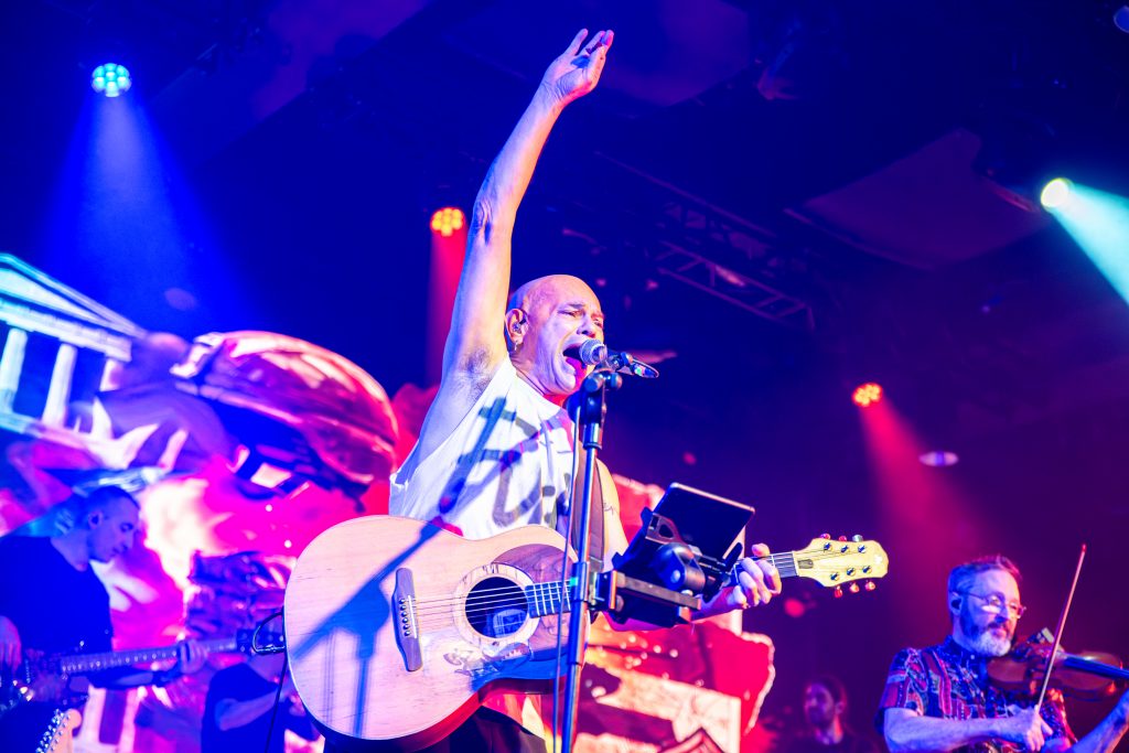El concierto ha arrancado con la fuerza instrumental de «El túnel de las delicias» fusionada con «Macedonia», una declaración de intenciones que puso en pie a un auditorio entregado desde los primeros compases. Jesús Cifuentes, líder de la banda, ha ejercido de maestro de ceremonias conectando con el público valenciano a través de cortes reivindicativos como «Trágame tierra», «Haz turismo» y «Legión de mudos».