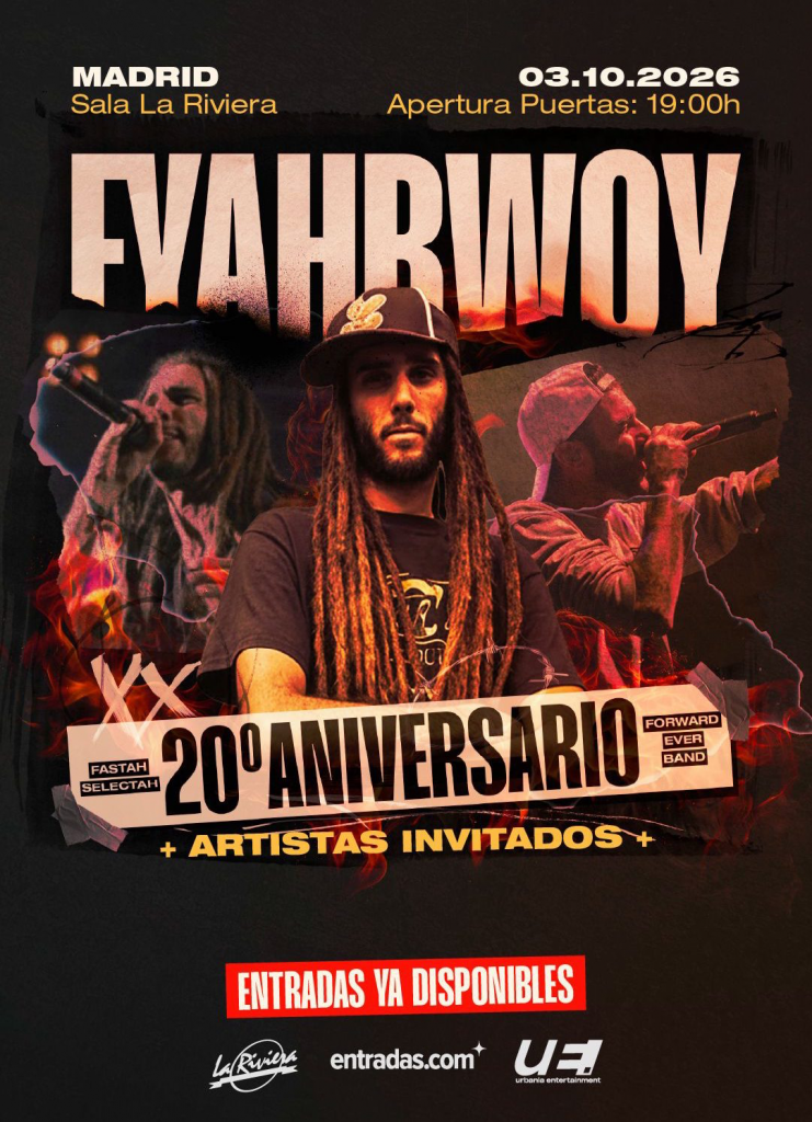 El próximo 3 de octubre de 2026, Fyahbwoy celebrará dos décadas de trayectoria con un Concierto 20º Aniversario muy especial, en la emblemática Sala La Riviera de Madrid. Será una noche concebida como un evento irrepetible, un recorrido por toda su carrera y un encuentro con el público que ha acompañado cada etapa de su evolución.
