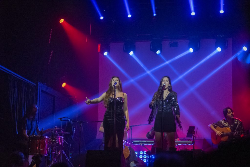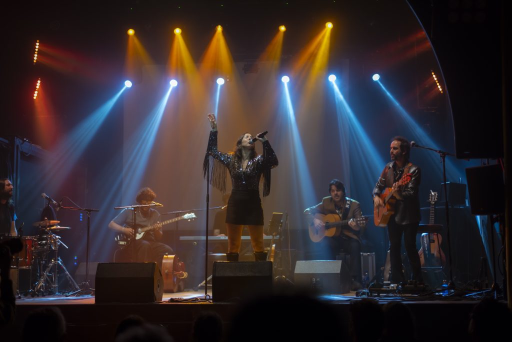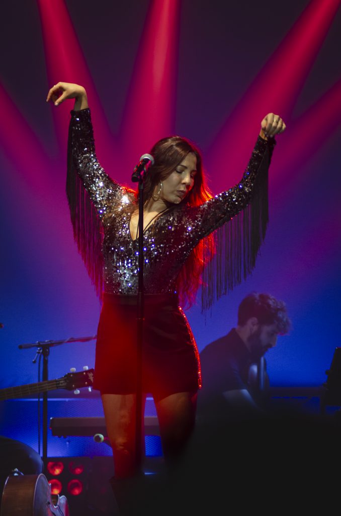 Y de la noche salimos otra vez al sol para que nos roce la piel la brisa salina con «Ahora», primer tema propio muy popero con aire flamenco y sonidos experimentales que Lucía deja para el final, entretejiéndolo con versos de Machado. Nos quedamos con una sensación como al final de un bonito paseo por la costa, antes de abrir los ojos para dejar la fiesta en alto. El barco en el que viajamos también ayuda a la experiencia, pues la Sala Villanos, la antigua Sala Caracol tan de Lola Flores, —emblema del flamenco en la capital y que seguro guarda entre sus paredes la sombra de fiestas míticas— agradece la presencia y alimenta la llama, donde la luz es un miembro más de la banda y nos va metiendo en esas atmósferas tan cuidadas, tan graficas, como si estuviéramos en una representación teatral.