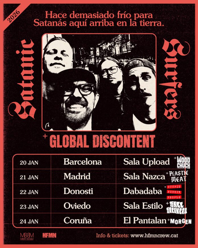 ¡Satanic Surfers vuelven a España en 2026 con una gira por cinco ciudades, acompañados por Global Discontent, pasando por Barcelona, Madrid, Donosti, Oviedo y A Coruña, con bandas locales como teloneros en cada fecha, ofreciendo punk rock melódico clásico y enérgico.